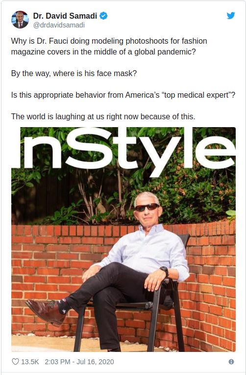 "Warum macht Dr. Fauci mitten in einer globalen Pandemie Fotoshootings für die Titelseiten von Modemagazinen? Übrigens, wo ist seine Gesichtsmaske? Ist dieses Verhalten von Amerikas "medizinischem Top-Experten" angemessen? Die Welt lacht uns deshalb gerade jetzt aus."
