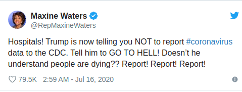 "Krankenhäuser! Trump sagt Ihnen jetzt, dass Sie Coronavirus-Daten NICHT an die CDC melden sollen. Sagen Sie ihm, er soll in die Hölle gehen! Versteht er denn nicht, dass Menschen sterben? Berichten Sie! Berichten Sie! Erstatten Sie Bericht!"