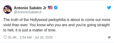 "Die Wahrheit über die Hollywood-Pädophilie ist dabei, lebendiger denn je herauszukommen. Sie wissen, wer Sie sind, und Sie werden direkt in die Hölle kommen, es ist nur eine Frage der Zeit."