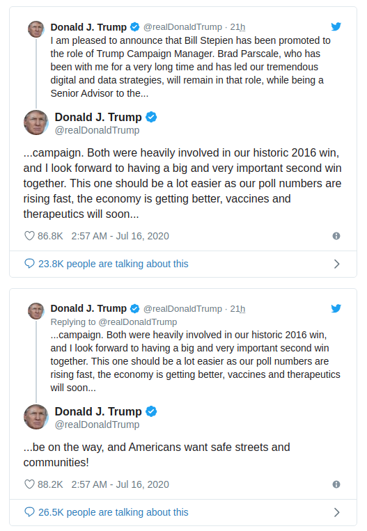 "Ich freue mich, Ihnen mitteilen zu können, dass Bill Stepien in die Rolle des Trump Campaign Managers befördert wurde. Brad Parscale, der schon sehr lange bei mir ist und unsere enormen Digital- und Datenstrategien geleitet hat, wird in dieser Rolle bleiben, während er als Senior Advisor für die Kampagne fungiert. Beide waren maßgeblich an unserem historischen Sieg 2016 beteiligt, und ich freue mich auf einen großen und sehr wichtigen zweiten gemeinsamen Sieg. Dieser sollte viel einfacher sein, da unsere Umfragezahlen schnell steigen, die Wirtschaft besser wird, Impfstoffe und Therapeutika bald auf den Weg gebracht werden und die Amerikaner sichere Straßen und Gemeinden wollen!"